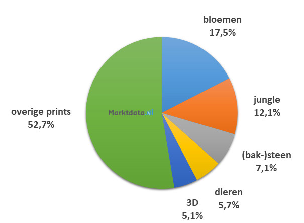 17,5 Procent van het zoekvolume met print- of materiaal-aanduiding heeft betrekking op bloemen. Op de tweede plaats staat de jungle print met een aandeel van ruim 12 procent in het zoekvolume. De nummer drie is de (bak)steenprint, welke 7,1 procent van het zoekvolume vertegenwoordigt. In de Behang Marktmonitor 2022 kan de volledige lijst met maar liefst 40 verschillende prints en materialen geraadpleegd worden.
