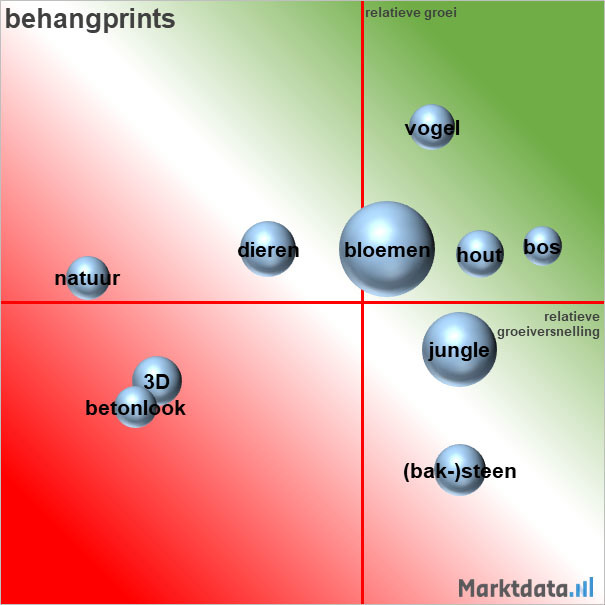 De prints van vogels, bloemen, hout en bos hebben een sterke uitgangspositie; zowel de relatieve groei als de relatieve groeiversnelling is voor deze prints relatief sterk van de tien onderscheiden prints en materialen. De 3D-prints en betonlook zitten juist in een ongunstig kwadrant als het gaat om behangprints en materialen.