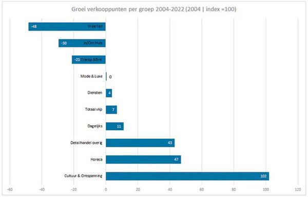 In de afgelopen 18 jaar hebben er grote verschuivingen plaatsgevonden in het aanbod binnen de wijkwinkelcentra. Onderstaande grafiek laat zien dat er tussen 2004 en 2021 “winnaars” en “verliezers” in de wijkwinkelcentra te vinden zijn.