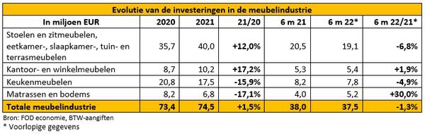 Tijdens het eerste semester van 2022 investeerde de Belgische meubelindustrie 37,5 miljoen euro, een daling met 1,3% in vergelijking met dezelfde periode in 2021. In 2021 werd in totaal 74,5 miljoen euro geïnvesteerd en bleef het investeringsvolume in vergelijking met het voorgaande jaar op peil.