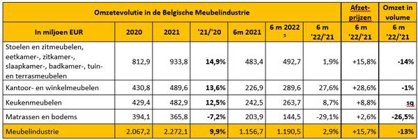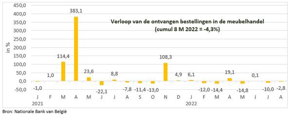 Volgens de maandelijkse enquête van de Nationale Bank van België daalden de ontvangen bestellingen in de Belgische meubelhandel tijdens de eerste 8 maanden van 2022 gecumuleerd met 4,3%. Enkel in januari en april konden nog positieve cijfers worden opgetekend. Ook de zomersolden verliepen eerder negatief. Dit is allicht te wijten aan de energiecrisis en de onzekerheid door de oorlog in Oekraïne, maar evenzeer aan een veranderd uitgavenpatroon na de beëindiging van de coronamaatregelen.