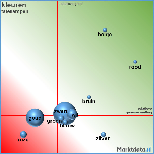 Zoals ook bij veel andere woondecoratie-artikelen zijn de kleuren zwart en goud overheersend bij tafellampen. Uit bovenstaand figuur blijkt dat met name beige en rood ten opzichte van de andere kleuren een gunstige positie innemen qua ontwikkelingen in het zoekvolume. Deze kleuren kennen de sterkste relatieve groei van het zoekvolume en de sterkste relatieve groeiversnelling. Dit geldt in iets mindere mate ook voor de kleur bruin. Maar qua omvang in het geheel aan kleuren zijn beige, rood en bruin nog wel kleine marktsegmenten. Voor roze is de situatie tamelijk ongunstig; roze kent zowel de laagste relatieve groei als de laagste relatieve groeiversnelling ten opzichte van de andere kleuren.