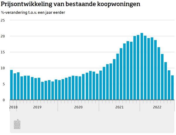 Bestaande koopwoningen waren in oktober 7,8 procent duurder dan een jaar eerder. Een maand eerder bedroeg de stijging 9,4 procent. Het is de zesde maand op rij dat de prijsstijging is afgevlakt. Dit blijkt uit onderzoek naar de prijsontwikkeling van bestaande particuliere koopwoningen in Nederland van het CBS en het Kadaster.