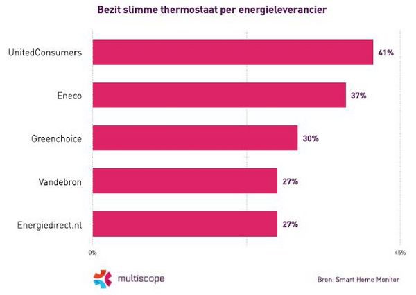Het aandeel slimme thermostaten is binnen Nederlandse huishoudens in een jaar tijd met 32% gestegen. Kostenbesparing is verreweg de belangrijkste motivatie voor de aanschaf. Binnen de top 10 energieleveranciers heeft UnitedConsumers het hoogste percentage bezitters (41%). Dit blijkt uit de zesde editie van de Smart Home Monitor, een grootschalig onderzoek van Multiscope onder bijna 5.000 Nederlanders.