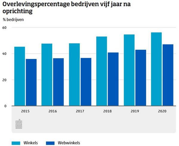 In 2020 werden in totaal 27 duizend nieuwe winkels opgericht, waarvan 88 procent webwinkels. In 2015 waren dit nog 15 duizend winkels, waarvan 61 procent webwinkels. Winkels hebben een steeds grotere kans om na vijf jaar nog te bestaan. In 2015 bestond 45 procent van de in 2010 opgerichte fysieke winkels en 36 procent van de webwinkels nog steeds.