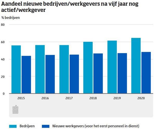 Voor nieuwe werkgevers steeg het aandeel dat vijf jaar later nog steeds werkgever is van 44 procent in 2015 naar 49 procent in 2020. Het aandeel werkgevers dat vijf jaar later nog steeds werknemers in dienst heeft is daarmee – in alle jaren - kleiner dan het aandeel overlevende nieuw opgerichte bedrijven. Het aantal nieuwe werkgevers (bijna 26 duizend in 2020) is ook veel kleiner dan het aantal oprichtingen (ruim 198 duizend). Nederland telde in 2020 ruim 311 duizend bedrijven met werknemers in dienst.