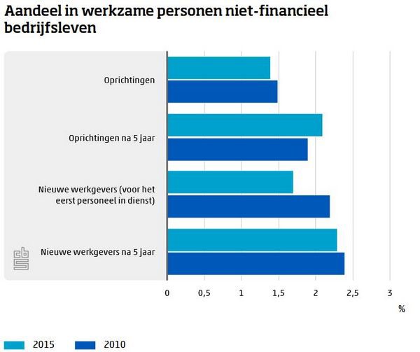 Het aandeel werkzame personen bij in 2015 opgerichte bedrijven bedroeg 1,4 procent van de totale werkgelegenheid. Bij de oprichtingen in 2010 was dit nog 1,5 procent. Het aandeel werkzame personen bij nieuwe werkgevers in de totale werkgelegenheid van 2015 was 1,7 procent, terwijl dat bij nieuwe werkgevers in 2010 nog 2,2 procent was. Het aandeel werkzame personen in de totale werkgelegenheid is zowel bij oprichtingen als bij nieuwe werkgevers na vijf jaar groter, ondanks dat de groepen bedrijven kleiner zijn geworden.