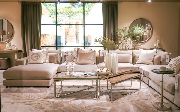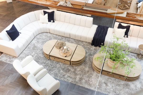 Natuurlijke tinten en materialen voeren de boventoon in de showroom van Rivièra Maison. In deze prachtige setting staat twee keer de Leccy Triangle coffee table 90 x 90 cm, een koffietafel die uit maar liefst 2 delen bestaat waarmee de klant kan spelen en schuiven.