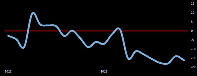 De index van de omzetontwikkeling van woondetaillisten is over de maand oktober 2022 uitgekomen op -2,2. Woonwinkels (winkels in meubels, verlichtingsartikelen en artikelen voor woninginrichting met een algemeen assortiment) noteerden in oktober een daling van de omzetwaarde van 2,2 procent ten opzichte van dezelfde periode een jaar eerder volgens het CBS. De omzetdaling werd veroorzaakt door een dalend volume (-14,5%). Het prijsniveau lag wel een stuk hoger dan een jaar geleden.