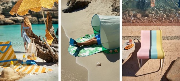 Ikea vervolgt: "Geniet van een stranddag onder de gele STRANDÖN parasol met witte stippen, terwijl je tot rust komt op de bijpassende, gestreepte strandmat met handig opbergvak. Na een lange dag relaxen, vouw je de strandmat in een handomdraai op tot een schoudertas en berg je de parasol op in de gestipte draagtas. Waait het iets te hard of ben je op zoek naar een schaduwplekje? Kruip dan onder het groene STRANDÖN wind- en zonnescherm en dommel weg met het geruis van de zee op de achtergrond. Als je liever thuis van de zon geniet, dan kan dat in de kleurrijke gestreepte schommelstoel.