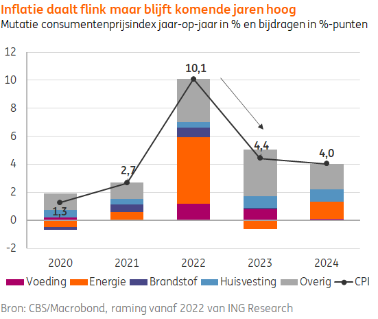 De inflatie lijkt over de piek heen, maar blijft met zo’n 4,4% ook in 2023 nog hoog. In de pijplijn zitten nog kostprijsstijgingen vanwege eerdere pieken in internationale inkoopprijzen voor onder andere ruwe grondstoffen, vervoer en energie. Ook gaan hogere loonkostenstijgingen bijdragen aan inflatie. Huren en tabaksbelasting leveren eveneens een bijdrage aan de inflatie in 2023. Aan het begin van dat jaar loopt een aantal overheidssteunmaatregelen af, zoals de verlaging op de energiebelasting, wat de energie inflatie omhoogstuwt. Daar staat tegenover dat het energieprijsplafond dan in werking treedt. De verwachting is dat een groot deel van het verbruik van de huishoudens hieronder zal komen te vallen. Het plafond heeft voor zowel gas als elektra een groot direct drukkend effect op de inflatie heeft. Dit plafond is echter tijdelijk en zal op het moment dat het komt te vervallen, begin 2024, voor hogere inflatie zorgen. Immers is de verwachting dat energieprijzen dan nog hoog zijn. Hoewel veel van de lopende pijpleidinginflatie in 2024 is verdwenen, is in 2024 dus toch weer sprake van hoge inflatie van zo’n 4%.