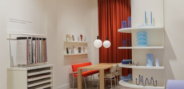 Furnée: “We keken heel bewust naar waar het pand om vraagt: een subtiele, verfijnde stijl met interessante contrasten. De ruimte heeft met haar hoge – en verderop in de winkel verlaagde – plafond en de vele intieme hoekjes, een kalme, sophisticated sfeer. Om die te behouden, kozen we voor wanden in een lichte aardetint, met accenten in zachtgroen en ijsblauw. In die rustige achtergrond komen onze bijzondere stoffen, organische vormen en poppy kleuren heel mooi tot hun recht. Statements maakten we vooral met art pieces, materialen en afwerking.”