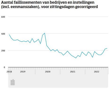 Het aantal failliet verklaarde bedrijven, voor zittingsdagen gecorrigeerd, is gestegen. Er zijn in november 7 bedrijven meer failliet verklaard dan in oktober, meldt het CBS. Het aantal faillissementen lag op het hoogste niveau in ruim twee jaar, maar bleef laag vergeleken met de periode voor het uitbreken van corona.