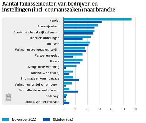 Niet gecorrigeerd voor zittingsdagen zijn er in november 256 bedrijven en instellingen (inclusief eenmanszaken) failliet verklaard. Van alle bedrijfstakken had de handel het grootste aantal faillissementen, namelijk 57. Dat zijn er 25 meer dan in oktober.