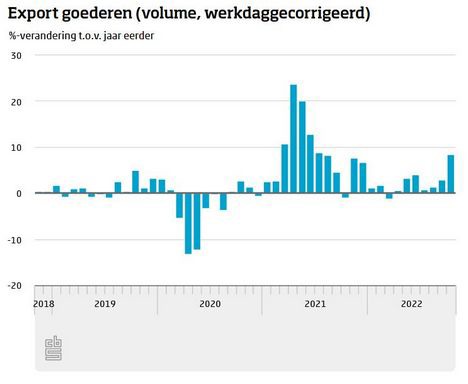 Het volume van de goederenexport was in oktober 8,5 procent groter dan in oktober 2021, meldt het CBS. Er werden in oktober vooral meer aardolieproducten, machines en apparaten, en transportmiddelen uitgevoerd. Het volume van de goederenimport was in oktober 7,4 procent groter dan in oktober 2021. Volgens de CBS Exportradar zijn de omstandigheden voor de export in december minder gunstig dan in oktober.