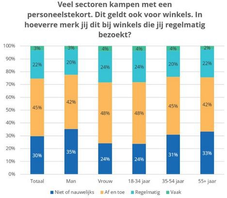 Veel sectoren kampen met een personeelstekort. Dit geldt ook voor winkels. Slechts 30% van de consumenten ervaart niet of nauwelijks personeelsproblemen. 70% merkt dit wel degelijk en 25% geeft aan dit regelmatig tot vaak te ervaren. Als gevolg voor het personeelstekort moet je bij winkels soms langer wachten op hulp. 52% geeft aan daar af en toe tot veel last van te hebben. Algemeen geldt dat de leeftijdsgroep 18-34 jaar het meeste last ervaart van de personeelstekorten bij winkels.