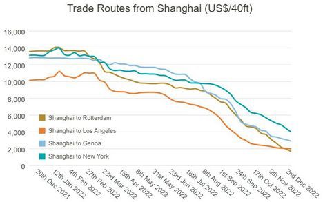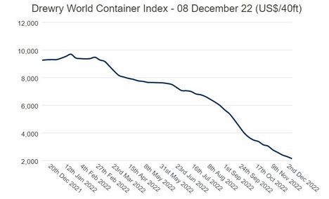 Ook de World Container Index (WCI) – die de prijs voor acht belangrijke vaarroutes van en naar de Verenigde Staten, Europa en Azië laat zien – is afgelopen week opnieuw gedaald. De index zakt al 11 maanden en is deze week met 6 procent gedaald tot 2.138,70 Amerikaanse dollar.