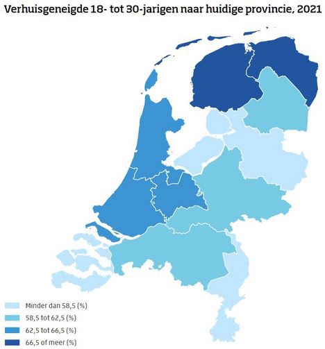 In de provincie Groningen overwogen 18- tot 30-jarigen met 70 procent het vaakst om te verhuizen. Deze verhuisgeneigde jongeren zijn zowel de jongeren die hebben aangegeven beslist wel of misschien te willen verhuizen in de komende twee jaar, als jongeren die wel zouden willen verhuizen, maar niets kunnen vinden. In Zeeland (55 procent) en Overijssel (56 procent) waren relatief weinig jongeren met een verhuiswens.