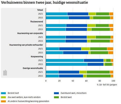 Vooral thuiswonende jongeren, en jongeren die een corporatiewoning huren, wilden in 2021 minder vaak beslist verhuizen dan in 2015. Het aandeel 18- tot 30-jarigen dat zegt te willen verhuizen, maar geen andere woning kan vinden, is sinds 2015 het sterkst toegenomen onder jongeren die huren via een private verhuurder.