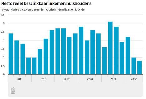 De stijging van het totaal aan ontvangen uitkeringen bedroeg 5,1 procent. Huishoudens met lage inkomens kregen compensatie voor de gestegen energieprijzen en er werden meer AOW-uitkeringen uitgekeerd. Huishoudens betaalden 2,8 procent meer belastingen en sociale premies. Om tot het reëel beschikbaar inkomen te komen, wordt het netto beschikbaar inkomen gecorrigeerd voor prijsstijgingen.