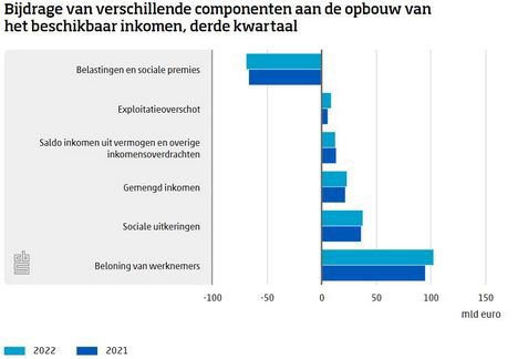 Het inkomen van zowel werknemers als zelfstandigen lag hoger dan in het derde kwartaal van 2021. De totale beloning van werknemers groeide met 8,3 procent. Het aantal gewerkte uren groeide met 3,2 procent, terwijl de cao-lonen met 3,4 procent stegen. Het gemengd inkomen lag 7,3 procent hoger.