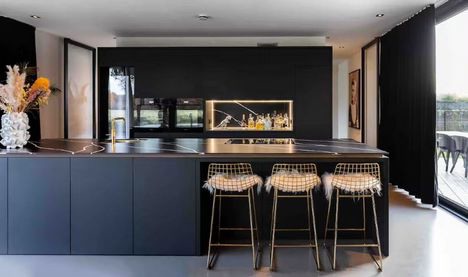 Deze keuken met Silestone Eternal Noir ademt 'glamour'. Het is gewaagd, de combinatie van materialen, de toepassing ervan, classy en luxe. "Dit ontwerp geeft het gevoel van high class luxe, het voelt als de haute couture onder de Keukens. De combinatie van mat en glossy material, de kleine details in afwerkingen zorgt voor een prachtig resultaat."