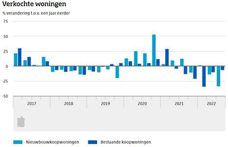 In het derde kwartaal van 2022 zijn ruim een derde minder nieuwbouwkoopwoningen verkocht dan een jaar eerder. Dit is de grootste daling sinds de start van de meting in 2015. Dit blijkt uit nieuwe cijfers van het CBS, het Kadaster en Eurostat.