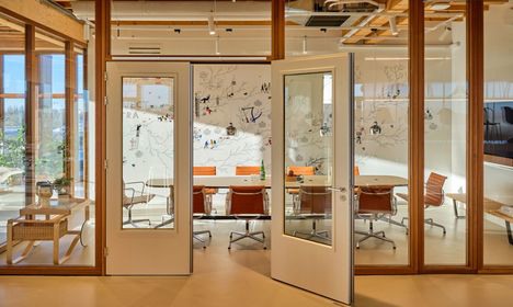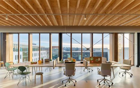 De ruimte van 600 m² is volledig uit hout opgetrokken. De showroom op de bovenste verdieping wordt omringd met natuurlijk licht en biedt een fantastisch uitzicht op het Amsterdamse IJ. De open lay-out dient als flexibel platform voor het tonen van de kantoorconcepten van Vitra en het stimuleren van samenwerking met klanten en partners.