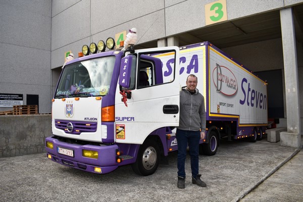 Een trotse Steven Van Caenegem met zijn truck, in de paarswitte kleuren van voetbalclub Anderlecht.