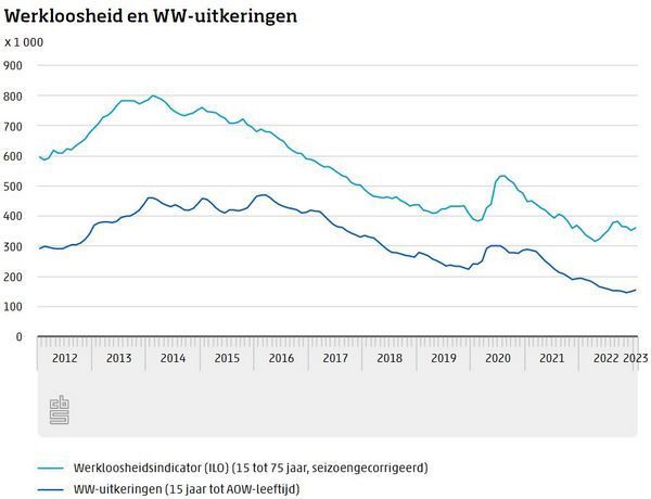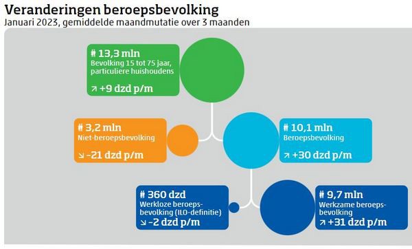 In januari 2023 waren 360 duizend mensen van 15 tot 75 jaar werkloos. Daarmee steeg het werkloosheidspercentage van 3,5 in december naar 3,6 in januari. De ontwikkeling van het aantal werklozen meet het CBS als gemiddelde verandering in de afgelopen drie maanden. In de maanden november tot en met januari nam het aantal werklozen nog licht af met gemiddeld 2 duizend per maand. Het aantal werkenden van 15 tot 75 jaar steeg in dezelfde periode met gemiddeld 31 duizend per maand. UWV registreerde eind januari 154 duizend lopende WW-uitkeringen.