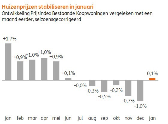Halverwege 2022 sloeg de woningmarkt na bijna een decennium van oplopende woningprijzen om. Tussen juli en december daalden de prijzen en nam het tempo van de prijsdalingen toe: zo daalde de woningprijzen in december gemiddeld met 1,0% (seizoensgecorrigeerd) ten opzichte van een maand eerder. In januari maakten de prijzen een pas op de plaats en blijven ze met een kleine plus van 0,1% maand-op-maand (seizoensgecorrigeerd) nagenoeg stabiel. Vergeleken met de prijspiek in juli liggen de huizenprijzen momenteel gemiddeld -2,7% lager.