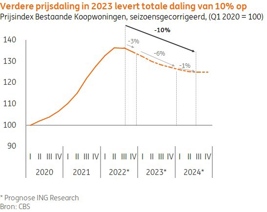 De woningmarkt koelt af. In de tweede helft van 2022 zijn de woningprijzen gemiddeld zo’n 3% gedaald. Hoewel de woningmarkt in januari een pas op de plaats maakt, gaan we voor heel 2023 uit van een verdere prijsdaling van zo’n 6%. De hogere rentes zijn hiervan de belangrijkste oorzaak. Zo stegen de rentes van nieuwe 10 jaars-hypotheekcontracten in 2022 gemiddeld met ruim 190 basispunten. Dit heeft het aankoopbudget van woningkopers verlaagd, en heeft vooral koopstarters hard getroffen. Dat meldt ING' er Mirjam Bani.