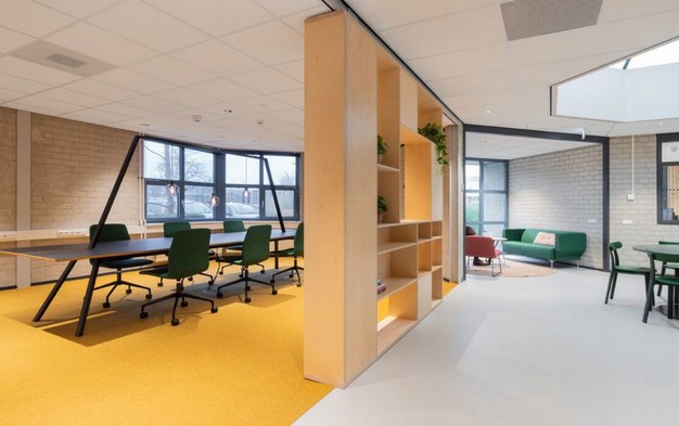 Robin licht het project nader toe: "Door een goede indeling te maken hebben we het slopen van wanden kunnen voorkomen, hebben we rasters van systeemplafonds en kozijnen hergebruikt. Binnenwanden voorzien van duurzame isolatie en verf. En sieren biobased vloerbedekking van geitenhaar de kamers. De nieuwe receptiebalie, pantry en vakkenkasten zijn gemaakt uit één soort duurzaam plaatmateriaal welke met formaldehyde vrije lijm verlijmd zijn. De afmetingen van de meubels zijn afgestemd op het minimaliseren van snijverlies.