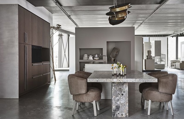 LINES is een industrieel kunstwerk opgebouwd uit lijnen. Ruwe, natuurlijke materialen lopen vloeiend in elkaar over en creëren een stoer geheel. Een robuust natuurstenen eettafelblad dat als het ware wordt gedragen door een flinterdun stalen kookblad: bij LINES draait alles om visuele gelaagdheid. Het spel met de verschillende, soms contrasterende, materialen vergroot dit effect.