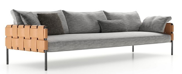 De Ratio bank, met zijn geweven lederen structuur, straalt een eigentijdse elegantie uit. Een overvloedige zitting met kussens, bekleed met stof, is even groot als onafhankelijk, ondersteund door een metalen structuur die aan de zijkanten is omwikkeld door een lederweefsel dat doet denken aan een golvend lint dat door dunne metalen pootjes van de grond wordt getild.