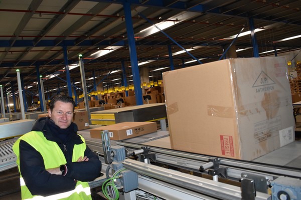 Christophe Donckels, mede managing director, poseert bij de lopende band in de warehouse.