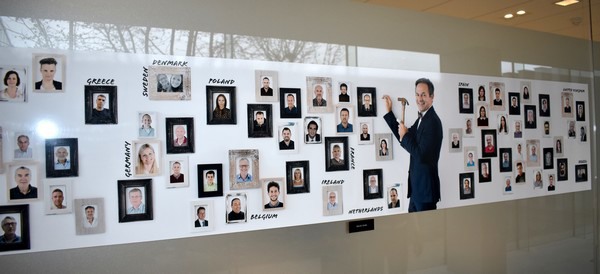 Ter ere van het 40-jarige bestaan werd deze fotocollage van het internationaal sales team opgehangen.