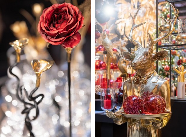 "De wintercollectie bevat zo'n beetje alle stijlen", vertelt Els (op de foto links samen met haar collega Winand). "We hebben niet een uitgesproken stijl. Nou ja... eigenlijk hebben we die wel. Een aantal zelfs, waarmee we inspelen op Viva Magenta, de dieprode 'kleur van het jaar'. Die past goed in het kerstgeheel, waar traditiegetrouw veel rood en groen inzit", zegt ze, terwijl ze haar bezoek langs de collecties voert. Er is zoveel te zien, dat het haast onmogelijk is om alles te benoemen. Els, die er al vijf jaar werkt, vertelt aan een stuk door wat er zoal geshowd wordt. Tot in detail weet ze enthousiast over de verschillende producten te vertellen.