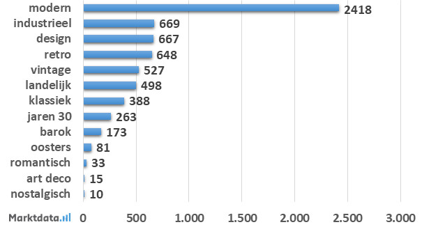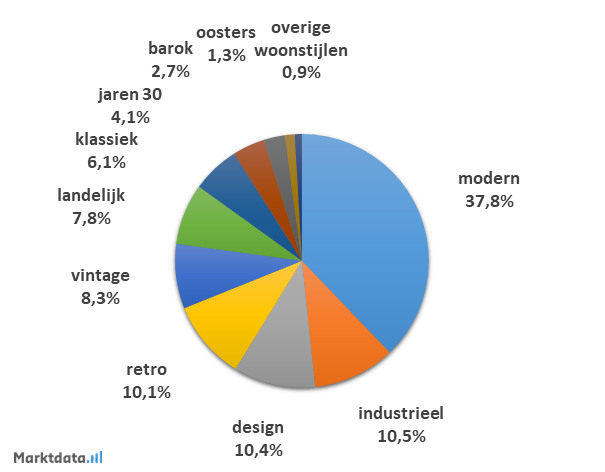 37,8 Procent van het zoekvolume met woonstijl aanduiding heeft betrekking op de moderne woonstijl. Op de tweede plaats staat de industriële woonstijl met een aandeel van 10,5 procent in het zoekvolume. De nummer drie is de design woonstijl, die 10,4 procent van het zoekvolume vertegenwoordigt.