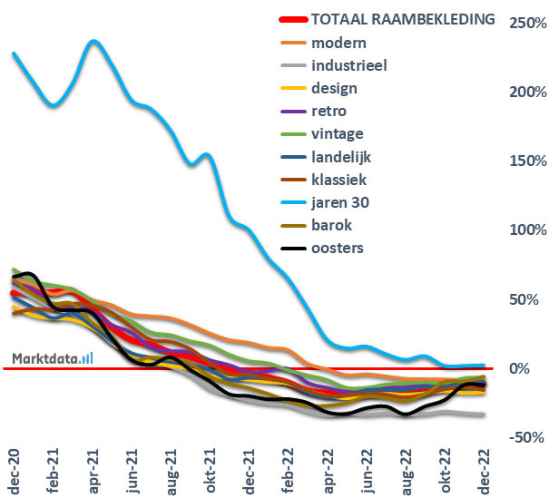 Uit het figuur blijkt dat de groei van het aantal zoekopdrachten naar raambekleding van specifieke woonstijlen in grote lijnen een gelijke trend doormaakt ten opzichte van het totaal aan raambekleding gerelateerde zoekopdrachten. Een uitzondering hierop is de jaren 30 woonstijl die sterk boven gemiddeld is gegroeid. Andere woonstijlen met een relatief boven gemiddelde ontwikkeling van het zoekvolume in de afgelopen drie jaar zijn de woonstijlen modern en vintage. Aanvankelijk was de industriële woonstijl redelijk populair, maar sinds medio 2021 laat deze woonstijl een beneden gemiddelde ontwikkeling zien in het zoekvolume. Momenteel kent de industriële woonstijl een daling van de voortschrijdende jaarmutatie van meer dan 30 procent.