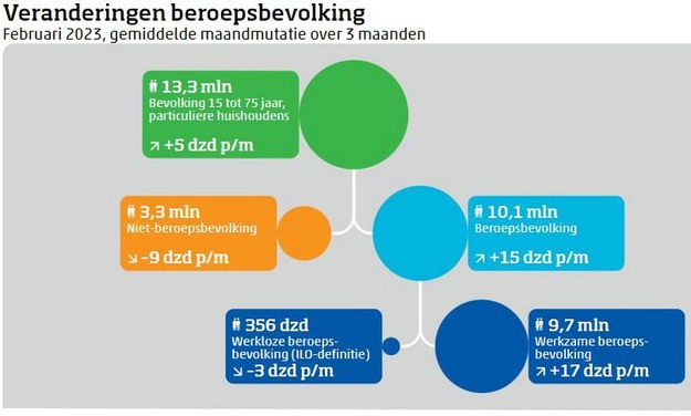 Het aantal werkenden van 15 tot 75 jaar nam in de afgelopen drie maanden met gemiddeld 17 duizend per maand toe. Als percentage van de totale bevolking (nettoarbeidsparticipatie) gaat het om 72,9. Dat percentage nam eind 2022 nog sterk toe, maar bleef in de eerste twee maanden van 2023 gelijk.
