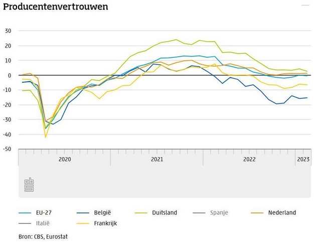 In februari 2023 was de stemming onder Nederlandse producenten opnieuw hoger dan gemiddeld in de Europese Unie. Van de belangrijkste Europese handelspartners lag alleen het vertrouwen in Duitsland hoger dan in Nederland. In België was de stemming het negatiefst. In het afgelopen jaar is de stemming onder producenten in Duitsland het meest gedaald, in Nederland het minst. Dat blijkt uit cijfers van het CBS en Eurostat.