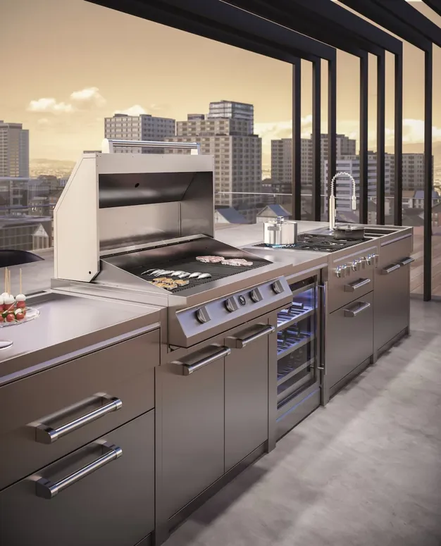 Modulaire buitenkeukens van Genesis, herkenbaar aan het afwerkingsniveau, de functionaliteit en de professionele prestaties.