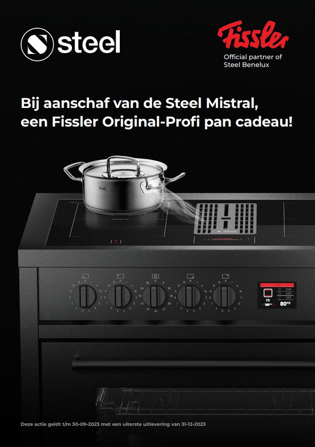 Trots is de voorman van STEEL Benelux op het feit dat er samengewerkt wordt met Fissler, al sinds 1845 de pannenfabrikant in Duitsland. Dankzij de hoogwaardige kwaliteit en gepatenteerde technieken, waaronder de Cookstarbodem, heeft het merk al vele prijzen gewonnen. De pannen en snelkookpannen van Fissler behoren tot het beste kookgerei dat wereldwijd te krijgen is. "Daarom past dit merk zo goed bij STEEL. Ook wij willen de beste zijn. Het mooie is dat zij ons benaderd hebben, een beter compliment kun je niet krijgen als fabrikant. Een fornuis is de motor van een keuken, die moet dus goed zijn. Datzelfde geldt voor je gereedschap, waaronder de pannen die je op het fornuis zet. Elke klant die een Mistral koopt krijgt een Fissler-pan cadeau", voegt hij er nog aan toe.