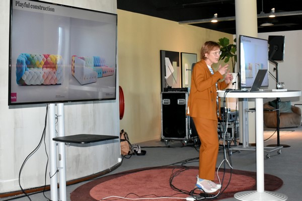 Aafje Nijman presenteerde in een ruim twee uur durende lezing woontrends vanuit de gedachte dat als we tegenover een vijand staan, mensen verschillende reacties laten zien. De een vecht, de ander schuilt, bevriest of gaat juist pionieren. Die vier natuurlijke reacties zijn gekoppeld aan de vier trends van 2024, te weten: Meaningful Earth, New Cocooning, Gentle Paradox en Playful Construction.
