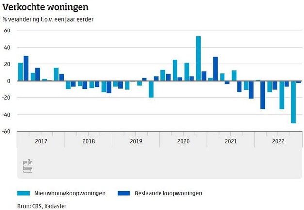 Bij de nieuwbouwwoningen is het aantal transacties in de loop van 2022 steeds sneller gedaald. In het vierde kwartaal ging het om ruim 5,3 duizend transacties, 50,6 procent minder dan een jaar eerder. Bij de bestaande koopwoningen daalde het aantal verkopen met 2,8 procent tot ruim 51 duizend. Deze daling was kleiner dan in voorgaande kwartalen.