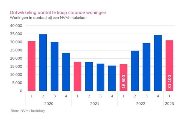 NVM-makelaars verkochten in 2023 in het - altijd rustigere - eerste kwartaal 28.500 bestaande koopwoningen. Dit is 2% minder dan een jaar eerder en 13% minder dan in het vierde kwartaal 2022. Het woningaanbod is op jaarbasis in het eerste kwartaal 2023 bijna verdubbeld ten opzichte van het eerste kwartaal 2022. Vergeleken op kwartaalbasis ligt het woningaanbod in het eerste kwartaal 2023 9% lager dan in het vierde kwartaal 2022. Bij NVM-makelaars staan ruim 31.000 woningen te koop.