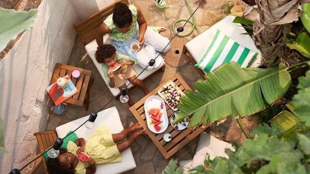 "Serveer een lunch aan de buitentafel van massief acaciahout of ontspan met een goed boek op het beige ligbed. Versier je tuin met de sfeervolle lampionnen en organiseer een gezellige barbecue op een warme zomeravond. Gebruik het zaklampje op zonne-energie na een mooie zonsondergang. Liever een dag met je voeten in het zand? De vrolijke gele parasol en de geel gestreepte strandmat", aldus Ikea.
