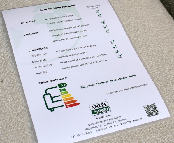 "Ik ben vorige week in Milaan geweest en dan wordt nog maar eens benadrukt dat werkelijk elk bedrijf met duurzaamheid bezig is", gaat Jeffrey verder. "Onder retailers leeft het nog minder, maar op de projectmarkt, die we bedienen vanuit Anker Projects, zien we een duidelijke toename. We werken op dat gebied ook met paspoorten (zie foto, red.) waarin omschreven staat welke duurzame materialen er zoal gebruikt zijn, van vulling tot verpakking. Van deze bank", zegt Jeffrey, onderwijl wijzend naar een groen/witte bank met daarboven de tekst Anker One, "zijn de hoezen vervangbaar. Eigenlijk koop je dan een bank voor het leven. De gebruikte materialen zijn waar mogelijk gerecycled, recyclebaar of 100% natuurlijk."