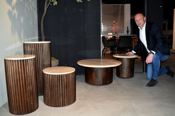Dennis Visscher poseert bij de meubelcollectie met travertin bladen.